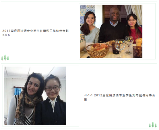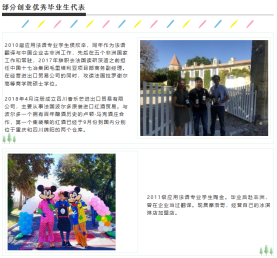 法语专业2010级本科生刘静云,2013年秋季参加公司交流项目赴法国波城大学读书。2014年被勒芒大学FLE(对外法语)专业研究生一年级录取,后通过面试,被浙江大学法语系录取成为法语代课实习老师,顺利完成研一学业。2015年被波尔多第三大学FLE(对外法语)专业研究生二年级录取,并在2016年顺利完成在戛纳Riviera French Institute语言公司的实习工作,以优异成绩毕业。因实习期间的突出表现,被正式签下CDI工作签证,成为法国语言公司的中国市场部经理,目前定居在南法蔚蓝海岸戛纳