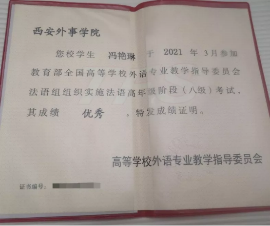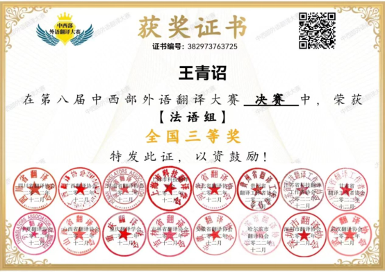 法语2001班员工王青诏 参加第八届西部外语翻译大赛荣获法语组全国三等奖