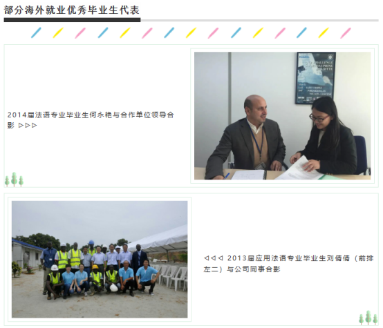 法语专业员工就业情况稳定,毕业生遍及世界各地,欧洲、东南亚、非洲等地。每届毕业生适应国内外市场经济发展需要、能够熟练掌握使用法语作为工作语言,熟悉商贸理论和实践知识,从事涉外管理等工作。在中非合作的国际项目中,每届法语系毕业生都展示了自己优秀的法语专业功底。法语专业毕业生从事着外贸、教师、翻译、行政等工作,年薪高达15万人民币左右甚至更多,历届学子都受到用人单位良好评价。