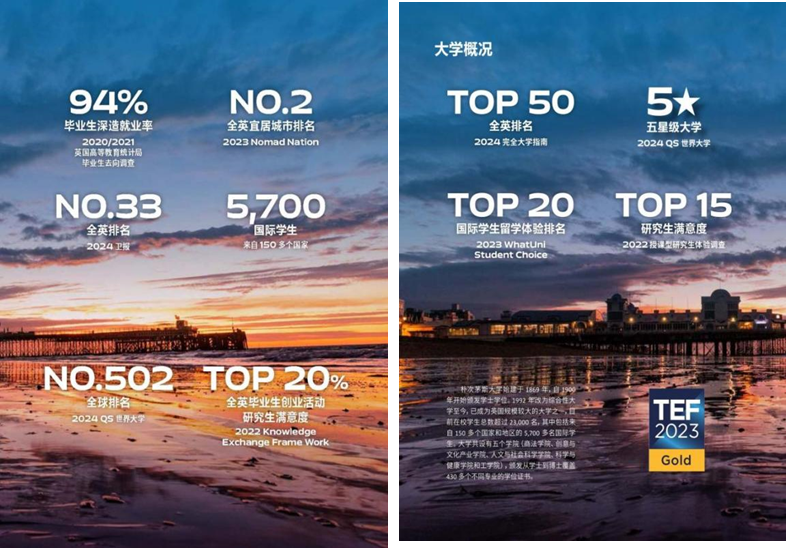 在过去一年里,朴次茅斯大学在全球获得了卓越的荣誉:在 2024年QS世界大学排名位列第 502 名,全英TOP50,并荣获五星级卓越大学称号,在REF2021(卓越研究框架 2021)中获评英国研究实力排名前三的现代大学。
