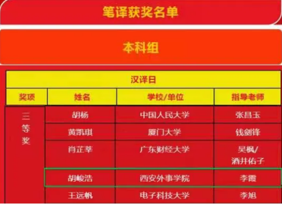 此次竞赛规模大,参赛人数众多。本科组汉译日组别中一、二、三等奖全国只有48人入围。胡峻浩同学能入围三等奖,实属难得。