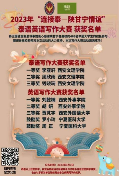 泰王国驻西安总领事馆与泰香米泰国餐厅共同举办的“连接泰——陕甘宁情谊”泰语英语写作大赛在2023年1月18日至2月20日向陕西、甘肃和宁夏的本科中国籍员工发起征文活动,陕甘宁地区共计469名中国老员工积极参赛。2023年3月7日,泰王国驻西安总领事馆公布了大赛获奖名单,我校中英国际班2020级刘懿楠同学荣获英语写作大赛一等奖,中英国际班2020级胡妍同学荣获英语写作大赛二等奖。