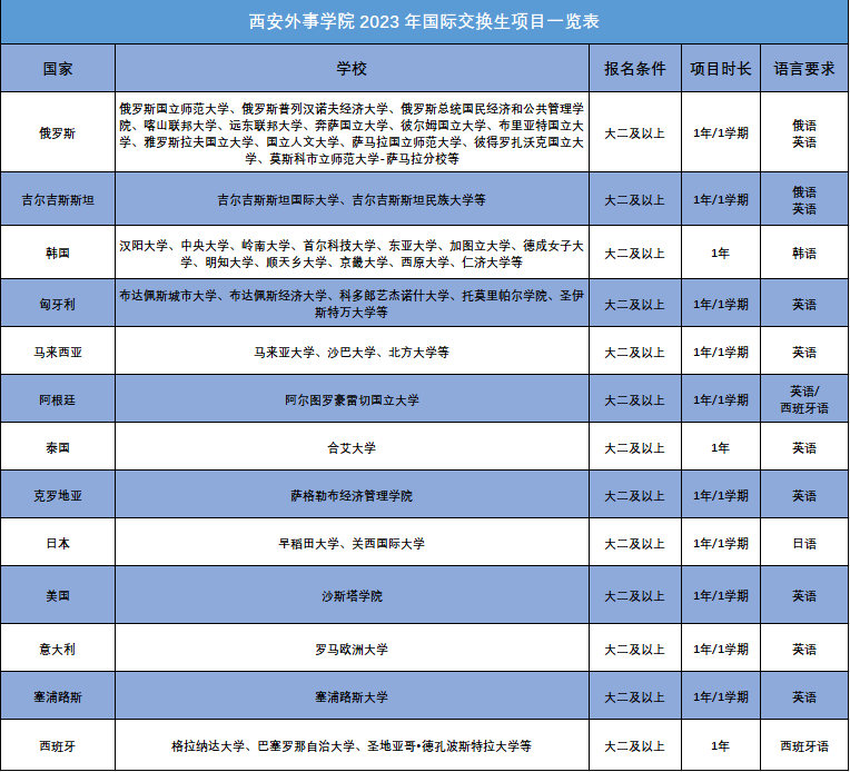 公司与泰国、俄罗斯、韩国、匈牙利、马来西亚、阿根廷、克罗地亚、日本、美国、意大利、塞浦路斯、西班牙等国众多高校具有长期合作关系,目前2023年秋季学期/春季学期免学费交换生项目正在火热咨询中。秋季交换生报名截止日期2023年4月30日,名额有限,先到先得哦!