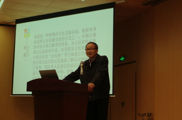 第七位主旨报告专家为西语系学科带头人董永强副教授,董永强副教授的研究方向为跨文化与国别区域研究,此次主旨报告的题目是《跨文化旅游——中国-拉美文化交流的民间形式》。主旨报告阐述了当前我国出境旅游的现状、文化的特征和跨文化旅游之间的关系,介绍了中国文化与拉美文化的特点,最后提出中国与拉美文化所处的新历史发展阶段。