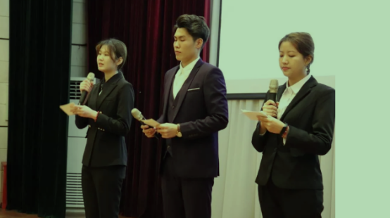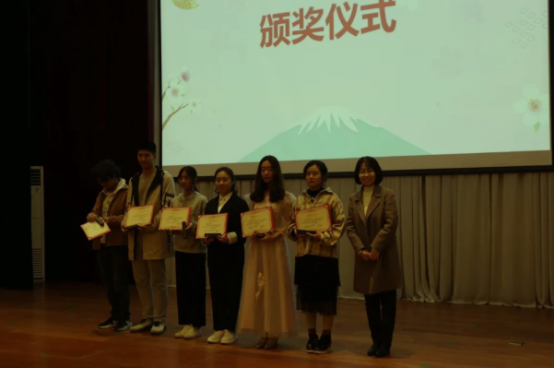日语系赵晓妮、李霞、黄丽琼、吴翠平、程雅洁五名老师担任大赛评委,日语1801班唐博、1901班姚雪琳、2002班高婉婷三名员工担任主持。