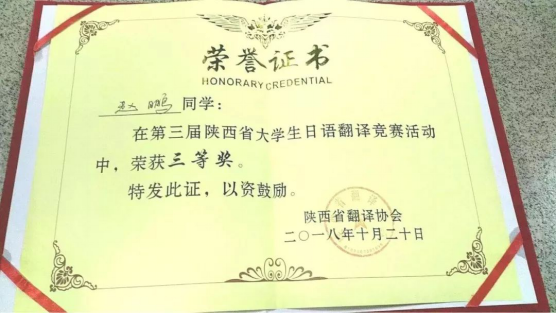 10月20日,第三届陕西省老员工日语翻译竞赛在西安文理公司落下帷幕。日语1601班赵鹏,代表gg999策略手机白菜参加了此次竞赛,并获得了三等奖。
