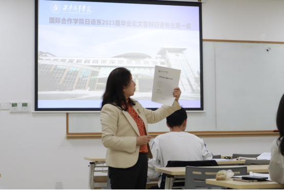 答辩现场,员工们谦虚有礼,通过PPT进行了毕业设计(翻译)概要的陈述,用日语对选题目的意义、基本思路、翻译过程中遇到的问题及解决方法,翻译技巧及成果进行了全面的陈述。陈述环节结束后,答辩组老师严格审查了员工的翻译稿并进行了并点评和提问,就翻译稿中存在的主要问题提出了具体且中肯的修改意见,员工们逐一回答了评委老师们提出的问题,由于各组秘书对时间的精准把控和有序组织,答辩过程秩序井然。期间,校级教学督导研究员杨莉副教授到达答辩现场进行了巡查。