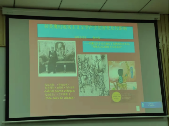讲座正式开始,董教授讲起了关于拉美文化的文学趣事、拉美文学的产生背景及其影响。董教授运用其丰富的知识以及广阔的见识为同学们讲述了许许多多关于拉美的故事,提高了同学们的兴致与好奇心,使同学们仿佛置身于历史中的拉美国家当中,大家在讨论过后更加认真地聆听董教授的讲授。