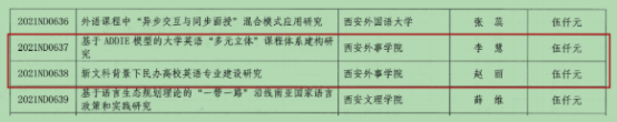 其中,李慧老师的课题《基于ADDIE模型的大学英语“多元立体”课程体系建构研究》,赵丽老师的课题《新文科背景下民办高校英语专业建设研究》喜获外语学科专项课题立项;
