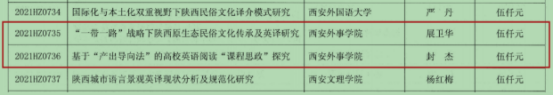 展卫华老师的《“一带一路”倡议下陕西原生态民俗文化传承及英译研究》,封杰老师的《基于“产出导向法”的高校英语阅读“课程思政”研究》喜获高等教育社科理论课题立项。