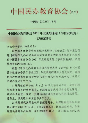 杨莉老师申报的课题《新时代民办西安高校国际交流与合作新模式探究》成功获批中国民办教育协会2021年度公司发展类规划课题立项。
