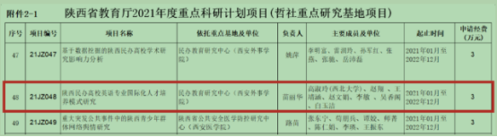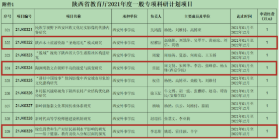 近日,陕西省教育厅公布了2021年度科研计划立项通知(陕教〔2021〕96号)。其中,公司苗丽华老师的《陕西民办高校英语专业国际化人才培养模式研究》获批2021年度重点科研计划项目;程雅洁老师、雷挺老师、李思斯老师获批2021年度一般专项科研计划项目。