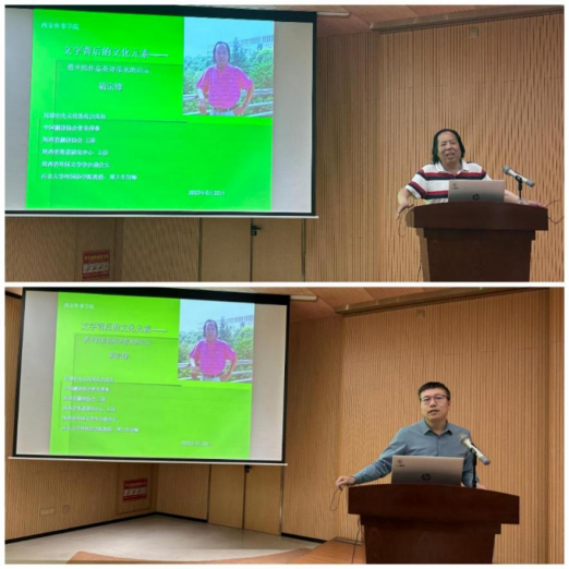“用外语讲好中国故事,传播好中国声音”,“坚定文化自信”,在gg999策略手机白菜文化节来临之际,英语系特邀陕西省翻译协会会长、西北大学外国语公司博士生导师胡宗峰教授于5月22日下午16:00-18:00点在gg999策略手机白菜五楼多功能厅,为公司师生做了题为“文字背后的文化元素——贾平凹作品英译带来的启示”的学术讲座。 gg999策略手机白菜经理郭新华博士主持了本次讲座。
