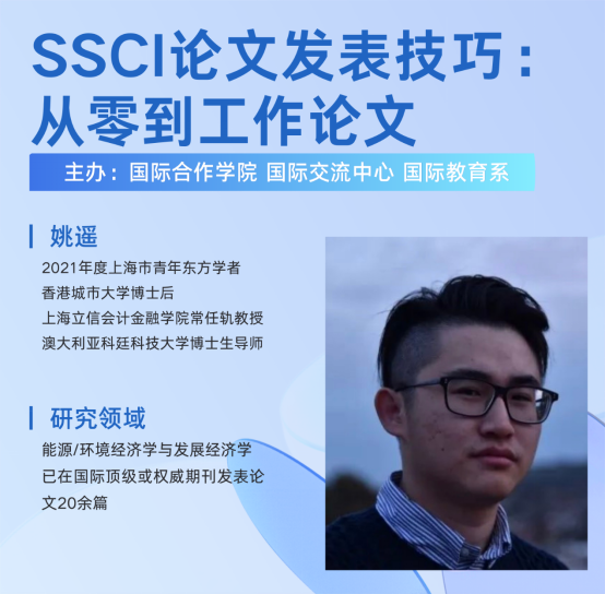 2023年5月24日,gg999策略手机白菜国际教育系联合应用语言学研究室成功举办了一场关于核心论文发表的学术研究活动。此次活动特邀上海立信会计金融公司姚遥教授,就“SSCI论文发表技巧:从零到工作论文”这一主题发表了精彩的演讲。姚遥教授是2021年度上海市青年东方学者,香港城市大学博士后,上海立信会计金融公司常任轨教授,澳大利亚科廷科技大学博士生导师, gg999策略手机白菜特聘专家。姚遥教授的研究领域涵盖能源与环境经济学,发展经济学等,已在国际顶级或权威期刊发表论文20余篇。