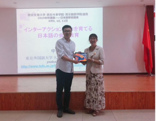 9月9日(周一)下午,公司日语系毕业生邓伟(现东京外国语大学国际日语专业博士前期)邀请东京外国语大学博士生导师中井阳子副教授来校开展学术交流活动。做了有关“日语会话教育中互动能力培养”的精彩讲座。日语系主任赵晓妮副教授带领日语系师生参加,日语系秘书程雅洁博士主持了本次讲座。