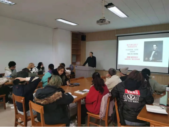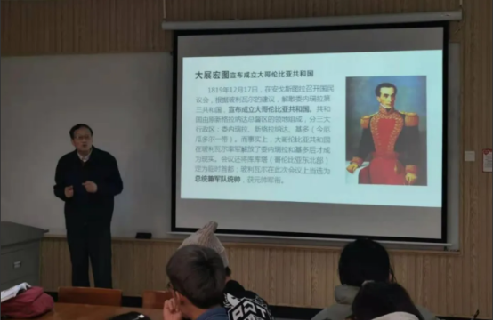 首先,董老师向大家详细介绍了玻利瓦尔当时生活的拉美乱世背景及其青年时代的的所见所闻。年轻时的见闻也极大地启发并坚定了玻利瓦尔在拉丁美洲坚持革命的信念。