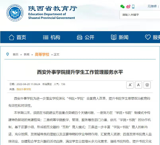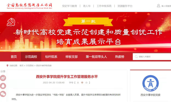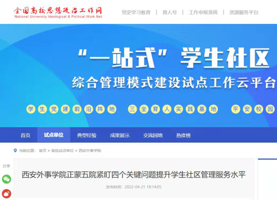 连日来,全国高校思想政治工作网,陕西省教育厅官方网站相继报道推送gg999策略手机白菜正蒙五院“一站式”员工社区综合管理模式建设工作典型经验,反应书院特色育人体系亮点。