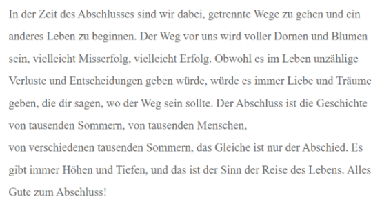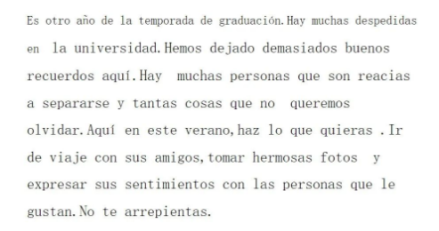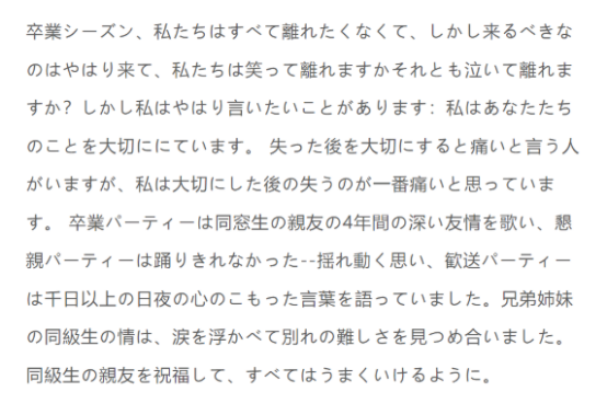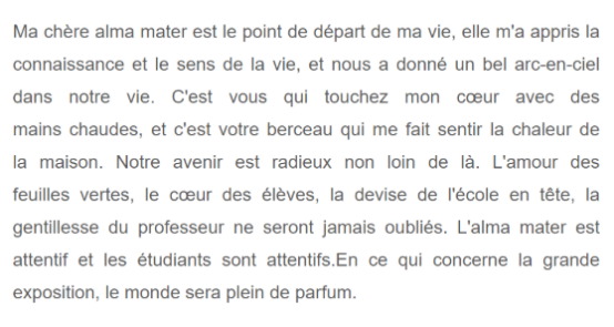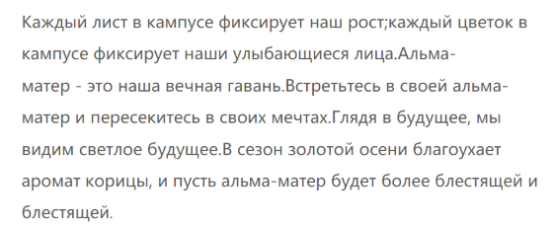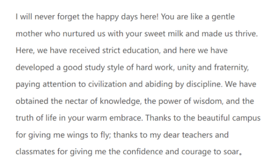 忘不了在这里的开心日子!您像一位温和的母亲,用甜美的乳汁哺育着我们,使我们茁壮成长。在这里,我们受到了好的教育,在这里,我们养成了奋发努力、团结友爱、讲究文明、遵守纪律的好学风。我们在您温暖的怀抱中获得了知识的琼浆、智慧的力量,做人的道理。感谢美丽的校园,给予了我飞翔的翅膀;感谢亲爱的老师和同学,给予了我展翅翱翔的信心和勇气。