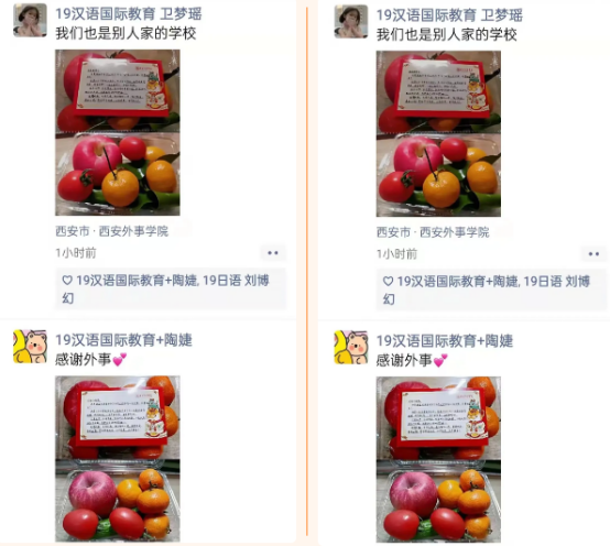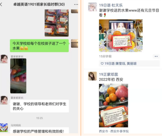 新年之初,西安被突如其来的疫情按下了暂停键。在这个特殊的元旦,公司精心的为同学们准备了新年的礼物,一份丰富的水果。各种各样的水果代表着不同的寓意:苹果象征着平平安安,小橘子代表着大吉大利,橙子是希望大家在新的一年里都心想事成。每份水果上都粘贴了新年祝福,表达了对同学们的关心和对未来的期望以及抗击疫情的勇气。这些礼物都由老师和志愿者们一一发放,确保每位同学都收到来自公司的问候。我们相信困难总会过去,日月山河,长安常安。