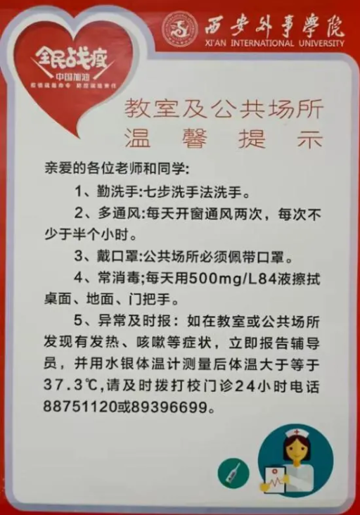 2. 做好健康检测,注意卫生,做好教室和宿舍的通风,可以自备浓度为75%的酒精自己对宿舍等进行消毒。