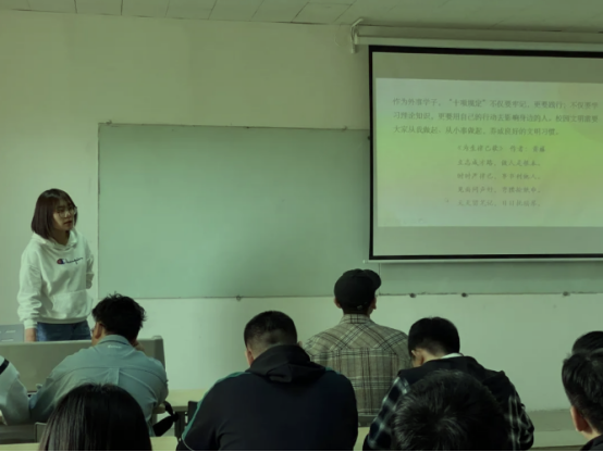 作为外事学子,《品德行为养成十项规定》作为我们的行为准则不仅要牢记,更要践行;不仅要深刻学习,更要用行动去影响身边的人。校园文明需从我做起、从小事做起,养成良好的文明习惯。辅导员王慧慧老师带领同学们再次认真学习了《十项规定》以及《为生律己歌》,对大家提出严格要求,文明交往,自觉保持教室卫生整洁,不畏旁人目光践行弯腰捡纸巾,事事利他人。老员工行为规范强调的仅是生活中微不足道的小事,但点滴见智慧,自古欲成大事者,必先成小事。