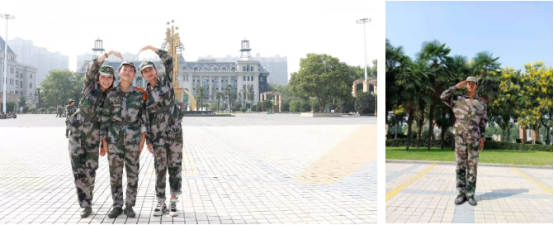 我们站立,跨步,蹲下,几乎把昨天教过的动作都练了一遍,才开始教新动作——齐步走。刚开始我以为齐步走就是像高中军训一样闹着玩玩,但分步动作简直又累又硬。我们迈开双腿,将右手伸出,左手向后,背上的肌肉绷紧,努力维持左右手的位置。没过多久就汗流浃背,大汗淋漓,但动也不敢动,生怕一动就会招致教官的“喊报告”惩罚,而且还会汗如雨下,滴得全身湿透,双眼如同蒙上一层厚雾,周围迷迷蒙蒙,加上太阳的毒晒,大脑犹如天花乱坠,差点摔倒。终于到了休息时间,我们盘腿而坐,在阴凉处吹着凉爽和谐的风。时不时有几位教官喊命令喊得嗓子破音,逗得我们哈哈大笑。