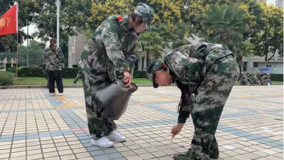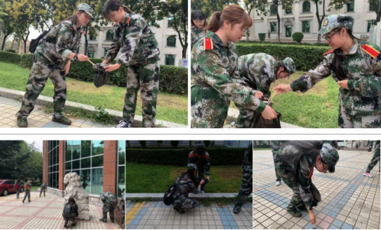 9月4日,军训四团63、66、67、68连因病不能参训的学员自发组成校园绿色小分队,在校园里捡拾垃圾,用实际行动践行《为生律己歌》,为美化校园环境做贡献,为军训增添绿色。