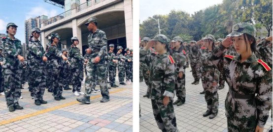 我们教官虽然不知道他姓甚名谁。虽然一开始觉得他没有65连那个白白的教官帅,但经过一天的训练越看他越顺眼,越看越帅。他带着我们去了学术苑的树荫下训练,虽然最后还是被撵到了大太阳底下,但感觉他真的是蛮温柔的。训练时他还会亲自示范,给我们看怎么摆臂,怎么齐步走 。看看隔壁男生连教官“凶神恶煞”的表情,我们真是太幸运了。我们教官真的很仁慈,很善良,一会儿就让我们休息一下。去喝个水,真的超喜欢这个教官。黄老师,你应该不会告诉教官吧?不然他知道了就要加强训练了,嘘…嘿嘿!