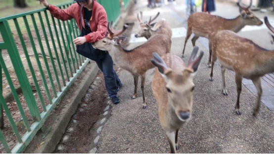 第三天,在加藤老师的带领下,我们乘坐新干线前往奈良。在奈良我们逛了东大寺、春日大社、兴福寺五重塔等寺庙,之后还去参观了大阪的通天阁。加藤老师不仅带我们去体验了射击游戏、还一直在为我们讲解相关的知识,让人受益匪浅。