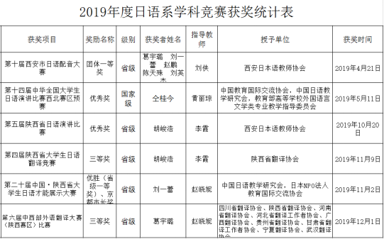积极组织员工参加陕西省以及全国举办的各种学科竞赛,取得了辉煌的成绩,在日语圈内备受关注。校内也定期开展一列学科竞赛活动,以竞赛活动检验教学效果、展示学习成果、促进团队建设,提高学习兴趣。