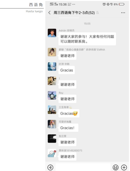 大家全神贯注,一遍遍的练习及模仿,都没有注意到下课的时间,感觉真的是意犹未尽。通过本次线上学习,大家了解了西班牙语发音的基础,让很多对西班牙语一无所知的同学们有了初步认识,感受到了西班牙语的魅力。课程虽然结束了,但大家学习西语的热情却不会消散。疫情防控宅在家,努力学习正当时。让我们认真过好每一天,以梦为马,不负韶华。