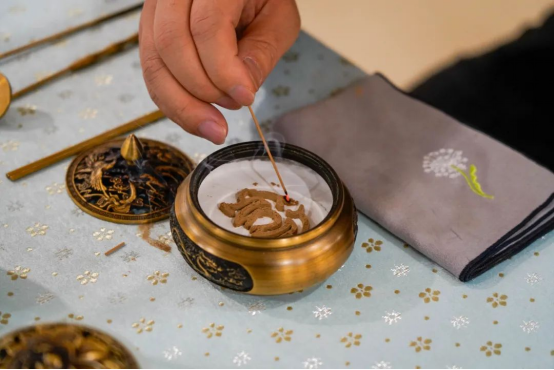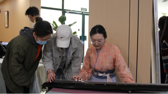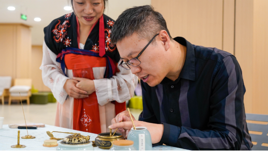 在茶艺、打香篆和古琴体验区域,专业老师一边讲解一边示范,动作雅致,手法轻盈。大家观茶艺、闻香道、赏古琴,兴致勃勃的体验其中乐趣,沁润在飘香的氤氲中,感受传统文化中的端庄典雅。