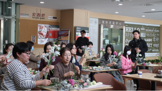 老子公司茶艺系主任朱曦等老师,现场教学讲授插花知识及技法,为大家介绍了鲜花常识、色彩搭配、插花技巧、保鲜方法等,进行插花演示,手把手指导老师们进行插花体验。大家充分发挥创造力,选花、去叶、剪接,在一片芬芳的花儿世界中,忙得不亦乐乎,完全沉静在自我创作的乐趣中。一束束精美别致的花艺作品展现在了大家面前,置身于鲜花丛中的女老师们展现花朵般美丽的笑言。