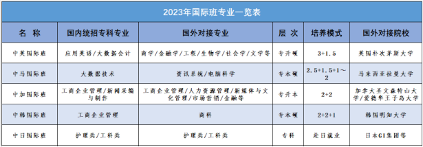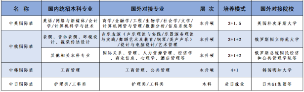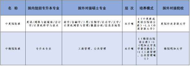 国内专业:英语(本科)、网络与新媒体(本科)、会计学(本科)、计算机科学与技术(本科)、应用英语(高职)、大数据会计(高职)