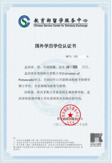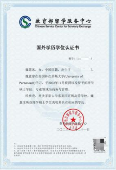 教育部留学服务中心学历学位认证书: