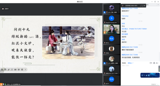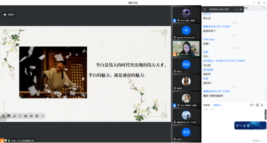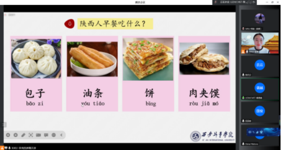 本次线上课程讲解了陕西美食以及南北饮食差异,李秀老师带领同学们学习肉夹馍、羊肉泡馍等陕西特色美食,还与黎德越、张氏海理、武文兴和俄罗斯的同学讨论了不同国家经常吃的早餐和午餐,以及各个国家的饮食差异。在探索西安地道美食的同时,融合新汉语水平考试HSK常用生词和语法,结合生活场景帮助员工,掌握汉语常用语。吕宁老师讲解了中华的瑰宝——唐诗。从红豆切入,用歌曲的形式向员工们介绍了王维的《相思》;介绍了诗仙李白,讲解了《月下独酌》中李白的孤独;用《春望》叙述出诗圣杜甫的写实风格;最后讲解白居易的《问刘十九》,在一首首中国古诗中,感受到中华文化的魅力以及“中国式浪漫”。