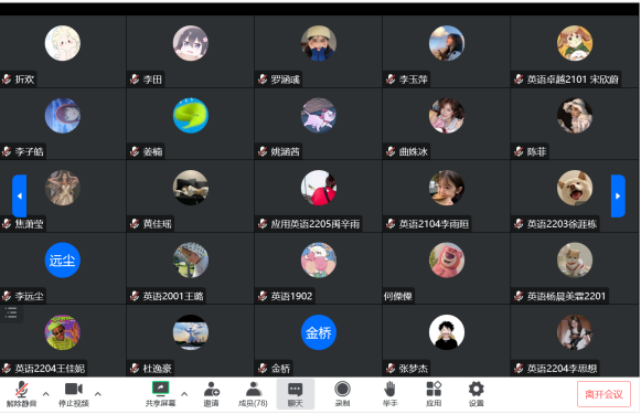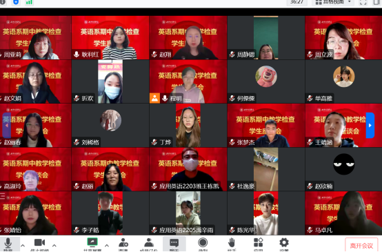 在两点开始的期中教学检查教师座谈会上,英语系主任高淑玲教授总结了前半学期的教学科研员工等各方面的工作,肯定了全系老师的勤勉及付出,从开学初的线上教学,到复课后的线上线下相结合教学,以及目前持续近一个月的线上教学中,英语系教师均严格按照公司及公司的相关规定保质保量完成各项任务。对于老师们反馈的问题,高主任做了相关解释说明并提出一些参考建议。同时,就下学期的教学任务做了安排。耿利红副主任总结了学籍预警工作中遇到的各种问题,做了详细说明,并提供了相应的解决方案,有利于各年级正蒙导师后续开展工作。赵丽副主任总结了前期员工参加竞赛及本科毕业生实习情况、详细解答了指导老师提出的问题,提醒实习指导老师跟踪了解实习生的相关情况,常沟通,常解惑,为员工顺利完成实习工作保驾护航。