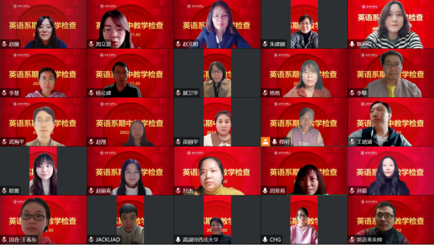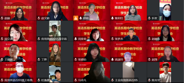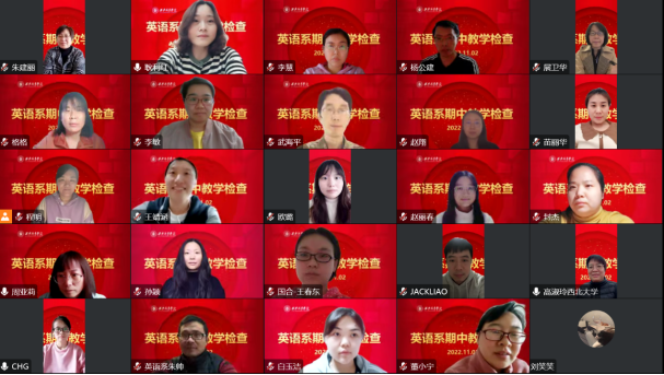 根据公司“关于 2022-2023 学年教学任务安排通知”(西外院教〔2022〕15 号)及《关于开展 2022-2023 学年第一学期期中教学检查工作的通知》(教研内字〔2022〕118 号)要求,同时为了更好地了解教师授课及员工学业情况,进一步促进后半学期的教学等工作,英语系于2022年11月2日下午两点开始在“云端”分别举办了期中教学检查教师以及员工座谈会。