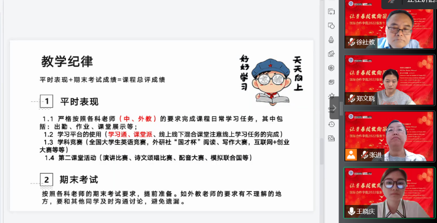 为了使2022届新生更好地开始新学期,适应大学学习,国际教育系于8月29日下午在线上组织新生入学教育,帮助新生快速了解院系、教师、学习与未来发展。