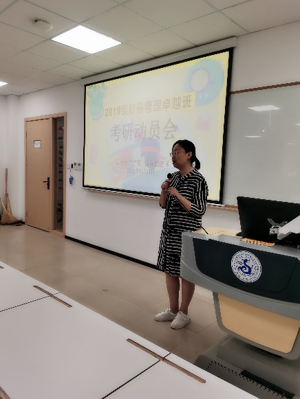 商公司财管系郭敏主任,国际教育系徐社教主任,张进副主任,刘书菡老师,卓悦老师为同学们做考前动员。郭敏主任首先强调考取研究生是卓越班员工的目标,考研的过程本身就是对大学几年来所学知识的总结和回顾,是对未来就业的准备。考研的战争已经悄然打响,集结号已经吹响,郭主任建议同学们用好暑假,组成学习小组,互相监督,做好计划想着自己的奋斗目标前进。