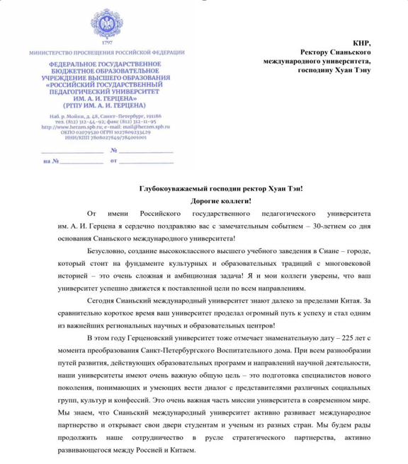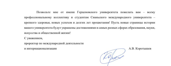 俄罗斯国立师范大学((Российский государственный педагогический университет имени А. И. Герцена) )国际活动及国际化副董事长 A. V. Korotyshev教授就公司三十周年校庆发来贺函,并对公司三十周年校庆表示热烈祝贺!