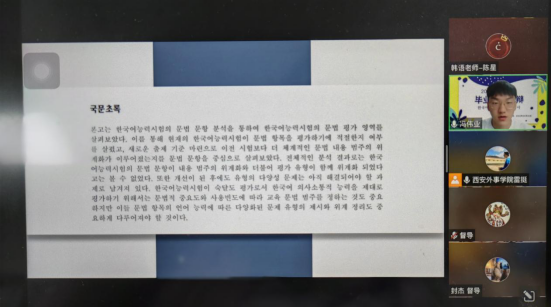 通过PPT进行了各自的毕业设计自述,用韩国语对自己的论文(翻译论文)进行了全面的陈述,并阐述了选题依据、基本思路、研究方法、遇到的困难及解决途径等。
