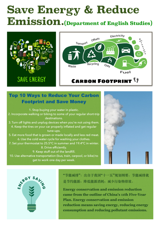 公司各系根据专业特色制作了以“节能减排”为主题的双语(中文+专业用语)海报在这里一一展示,快来pick你心仪的作品吧!(排序不分先后)