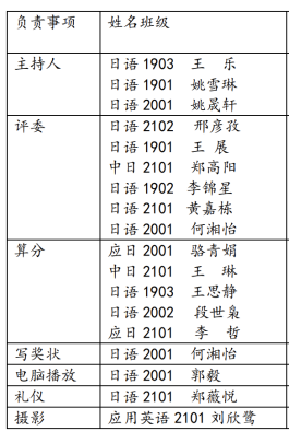 日语系杨硕老师担任教师评委,日语2102班邢彦孜、1901班王展、中日2101 班郑高阳、1902班李锦星、2101班黄嘉栋、2001班何湘怡同学担任员工评委。日语1901班姚雪琳、1903班王乐、2001班姚晟轩同学担任主持。