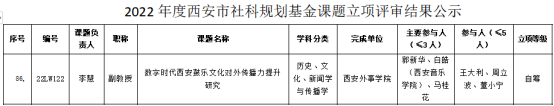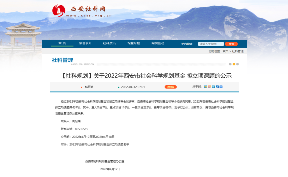 4月12日,西安市社会科学规划基金管理办公室发布了《关于2022年西安市社会科学规划基金拟立项课题的公示》,公司李慧老师申报的《数字时代西安鼓乐文化对外传播力提升研究》课题成功获得拟立项。