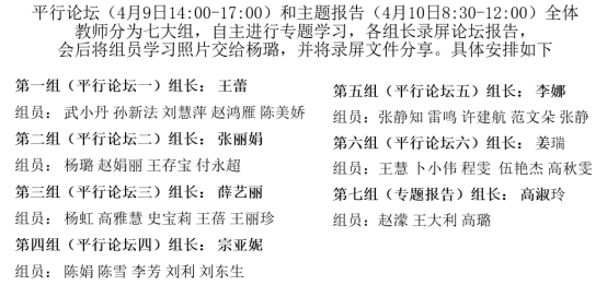 主旨报告后,就平行论坛和专题报告模块,高淑玲主任对全体大学英语部教师进行分组,并要求各组组长进行会议录屏,会后分享学习、思考 “在数字化、网络化、智能化背景下,如何利用教育信息技术、语言智能技术、数字资源环境助推大学英语课程思政、大学英语智慧教学、一流课程建设、教师素养提升”等
