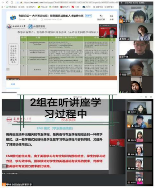 大学英语部教师在高淑玲主任的带领下,全员参加认真聆听了本次云端论坛的主旨报告和大学英语分论坛,并以小组为单位结合本校实际共同探讨了新格局下大英改革的新方向,力求尽快用更智慧的方案推动公司大英教学高质量的创新发展。大学英语分论坛的报告主要围绕“服务国家战略的人才培养体系”和“落实课程思政的公司产品创新”两大主题展开。发言人从各校校本特色出发,持续创新育人理念,实施“一体两翼”的课程体系,构建以O-AMAS和MIPAT课程群等为特色的混合式教学模式,为新时代大学英语公司产品改革提供了启发,也为公司持续推进大学英语分级分层改革和课程再设计提供了科学借鉴。