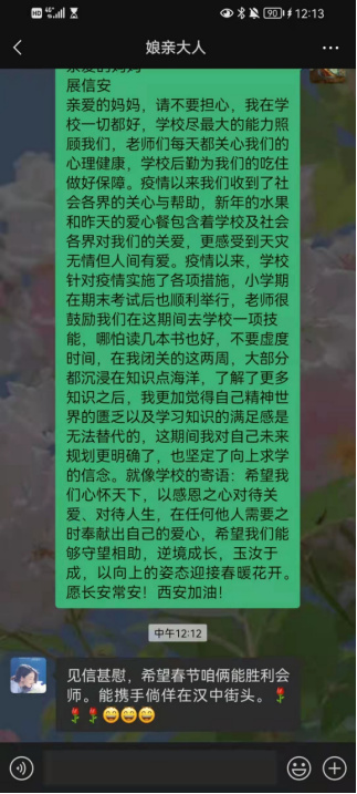 亲爱的宝贝女儿:这次疫情对你们是一次严峻的考验,也是一种成长,你要珍惜和同学老师在一起的这段难忘经历,多协助老师,帮助需要的同学。这也算是你为抗击疫情出一份力。寒日苦长,春日可待,一切美好都会如约而至,家里给你准备了好多好多好吃的,等你回来哎!