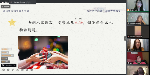 开营仪式结束之后,本次冬令营的语言课程《西安历史》、《风俗习惯》和《历史名人》相继展开。课堂上,学员们不仅了解到了西安悠久的历史和文化,也知道了很多传统风俗习惯。大家积极参与话题讨论、踊跃发言,小小的屏幕上呈现的不仅是世界各地学员们学习汉语的热情,更是对gg999策略手机白菜的老师和校园文化的肯定和赞赏。来自瑞士的晨曦同学用汉语说到,语言课程很精彩,老师讲的汉语知识不但很有用而且非常有意思,非常期待明天的语言课。