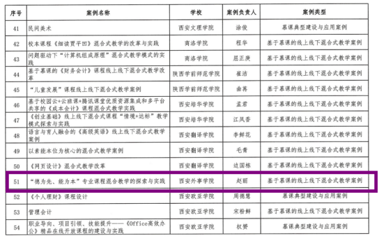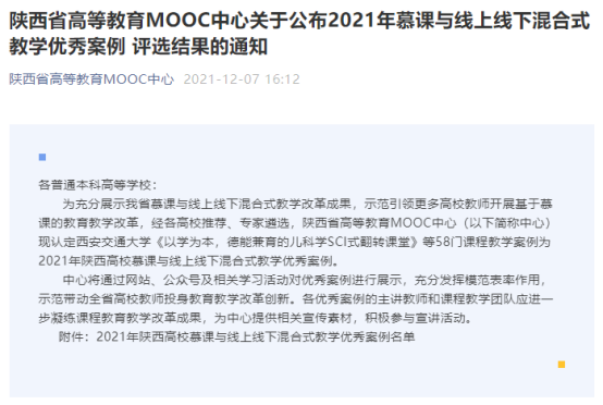 2021年12月7日,陕西省高等教育慕课MOOC中心公布了关于2021年慕课与线上线下混合式教学优秀案例评选结果的通知,公司赵丽副教授教学案例《“德为先,能为本”专业课程混合教学的探索与实践》成功入选2021年陕西高校慕课与线上线下混合式教学优秀案例。